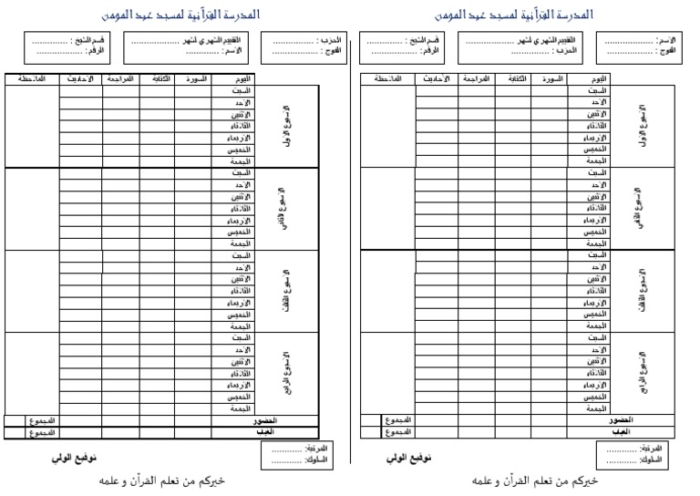 جدول متابعة حفظ القران. استمارة متابعة حفظ القران للصف الرابع الفصل الثاني 1440. هذه بعض من صفحات دفتر يوميات قرآنية و لتحميله كاملا اضغط على أيقونة تحميل الملف. نقدم لكم اليوم استمارة متابعة حفظ ومراجعة القرآن الكريم للطباعة وهذه الاستمارة من الوسائل الهامة جد ا التي انتشرت في السنوات الأخيرة بين معلمي القرآن الكريم والراغبين في حفظه وإتمامه حيث تيسر عملية الحفظ.