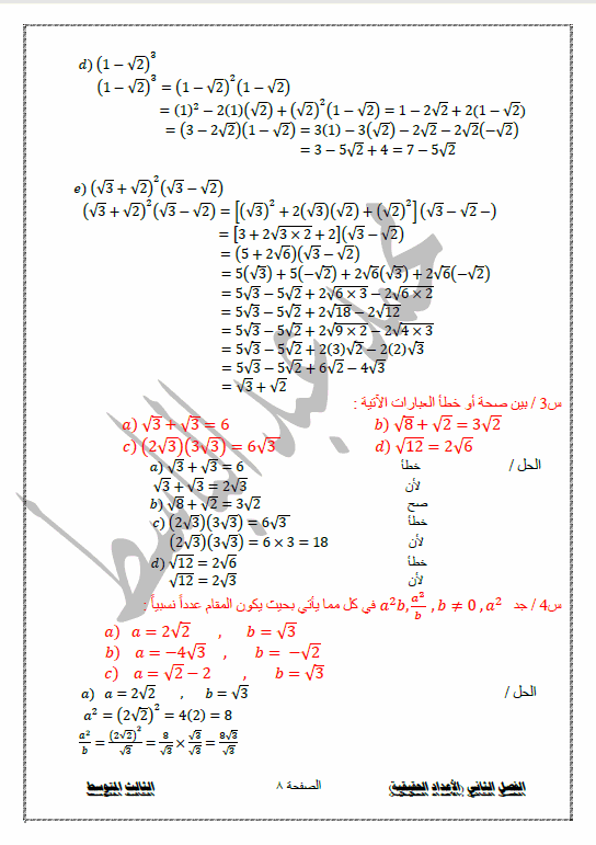 حل تمارين رياضيات الصف الثالث متوسط صفحة 8