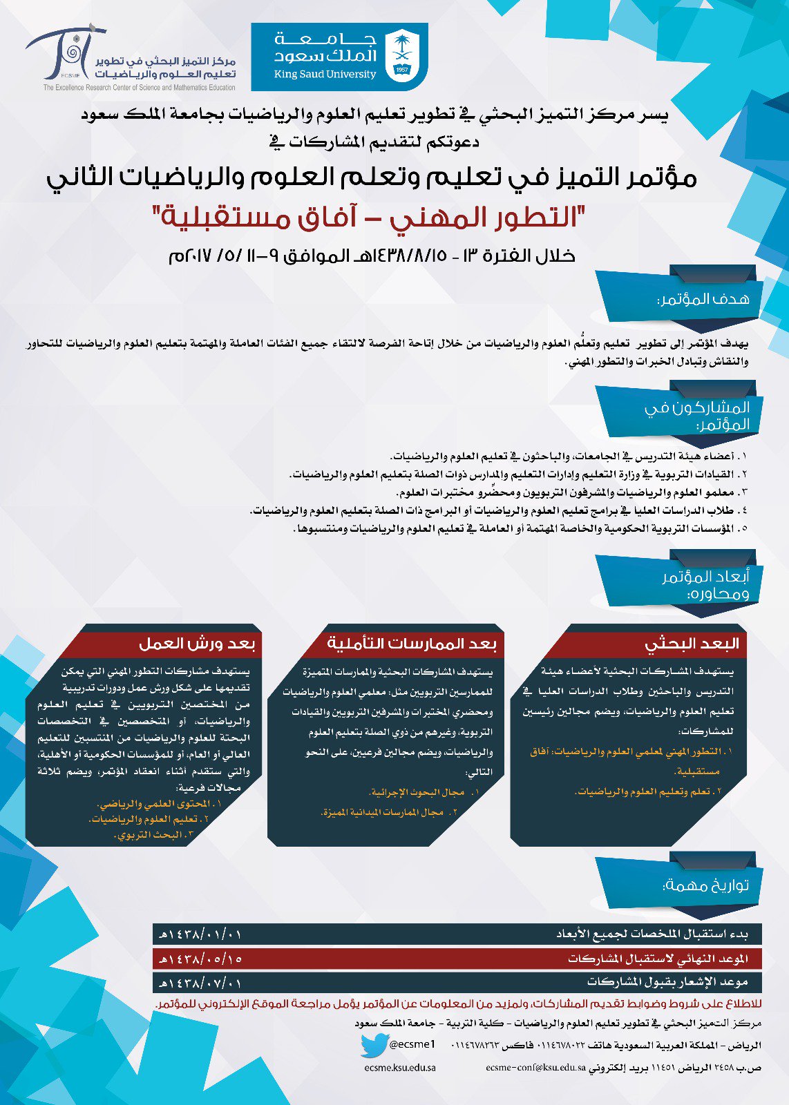 أفكر On Twitter ينعقد مؤتمر التميز الثالث في تعليم وتعلم العلوم والرياضيات في جامعة الملك سعود خلال الفترة من 5 إلى 7 رجب القادم ويستمر استقبال المشاركات في جميع أبعاد المؤتمر حتى 15 ربيع
